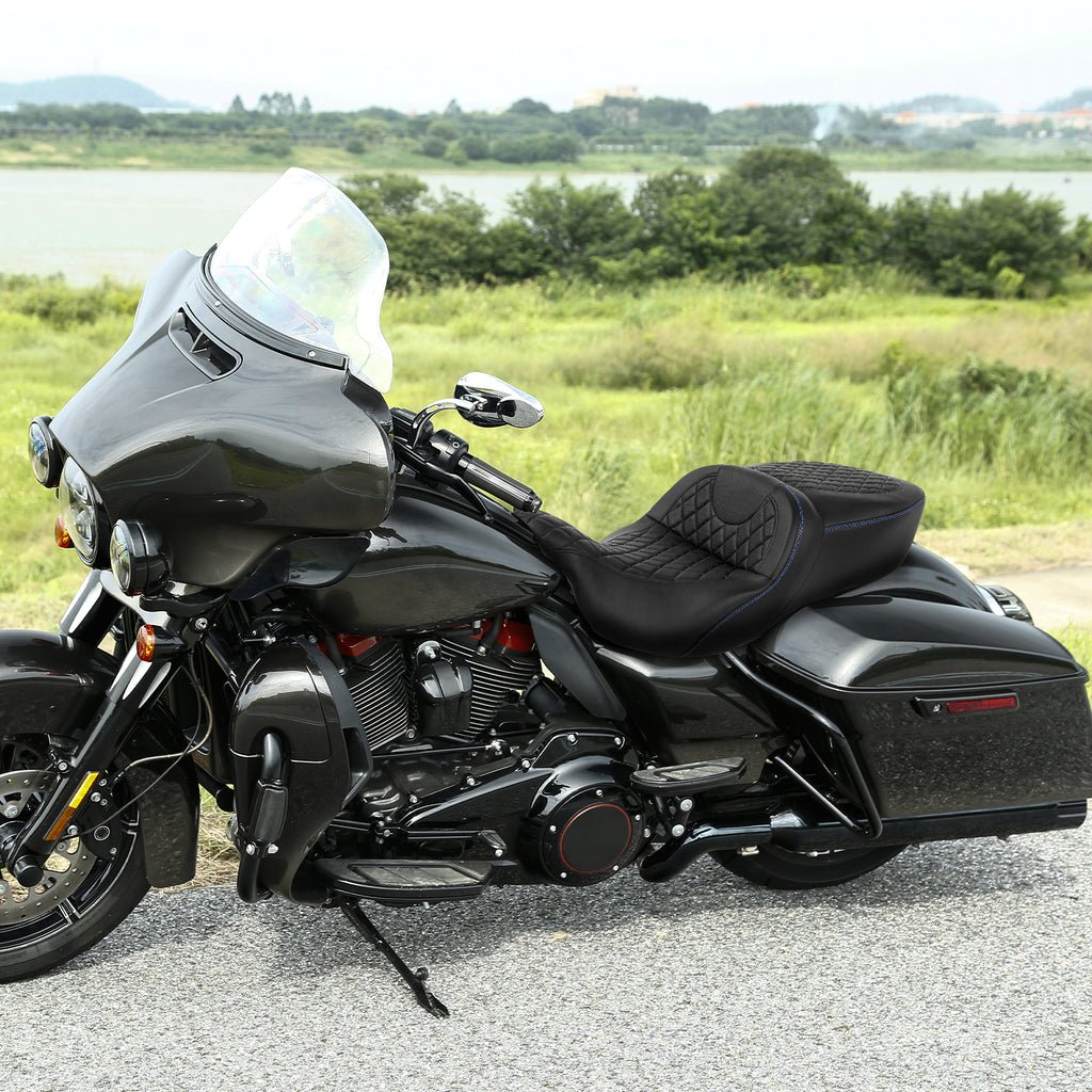 This touring seat adopts a step-up design. The Hammock style seat fits harley touring which provides back support for the rider and helps the rider sit in position and reduce impact from harsh road conditions, offering protection on the backside for both rider and passenger.